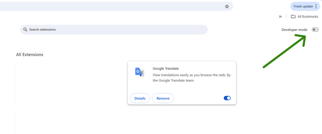 2- برای اینکه قابلیت نصب افزونه با فایل روی مرورگر کروم فعال شود بایستی همانند تصویر زیر گزینه Developer Mode را فعال نمایید.