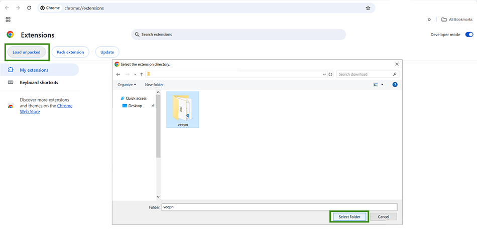 توجه داشته باشید فایل دانلودی افزونه به صورت ZIP است. بنابراین ابتدا روی فایل افزونه راست کلیک کرده و آن را Extract نمایید و سپس با زدن دکمه Load Unpacked فولدر Extract شده افزونه را به صورت کامل با زدن دکمه Select Folder انتخاب نمایید.
